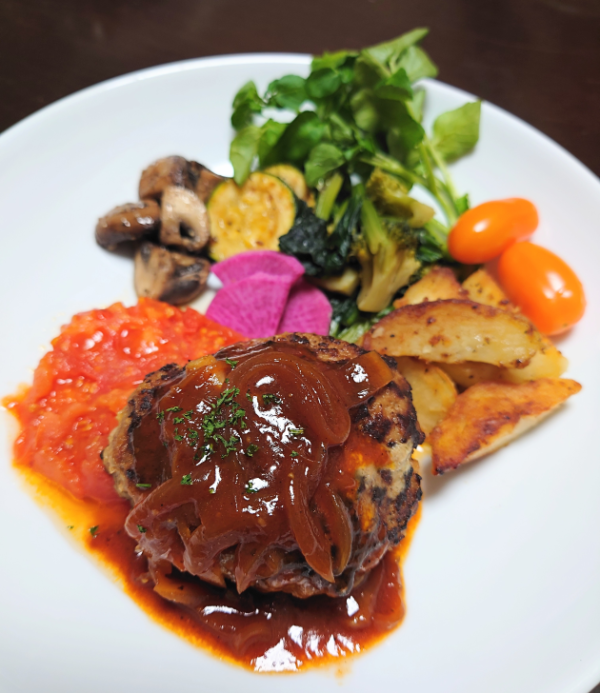 メインはあくまで後ろのぼやけている野菜たちなんですけどね。こんなにぼやけるとは。スマホのピントが信じられないくらいハンバーグにバチーンあっちゃったんでしょうがないね。