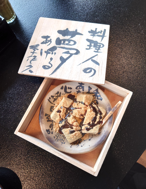 お料理はもちろん、このわらび餅が衝撃・・・っ!!これめっっちゃくちゃおいしい!!!歯ごたえちゃんとある系が好きな方は絶対頼んでください頼まないと損するから!!!ひとり一個頼んでも全然食べれちゃう