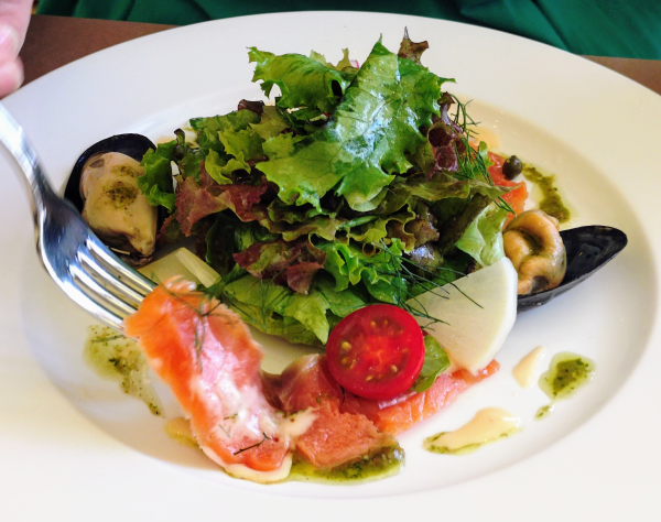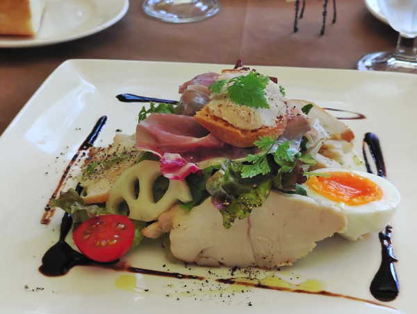 前菜は、「自家製スモークサーモンとムール貝のサラダ」と「大山鶏胸肉のスモーク、生ハム、半熟卵のサラダ」にしました。どっちも最高においしいです!野菜ひとつとってもすごく丁寧に調理されてるんだろうなという感じ。どうしたらこんな味が出せるんだ・・・。大山鶏の方写真の色がなんかむちゃくちゃ悪いですねなにこれ