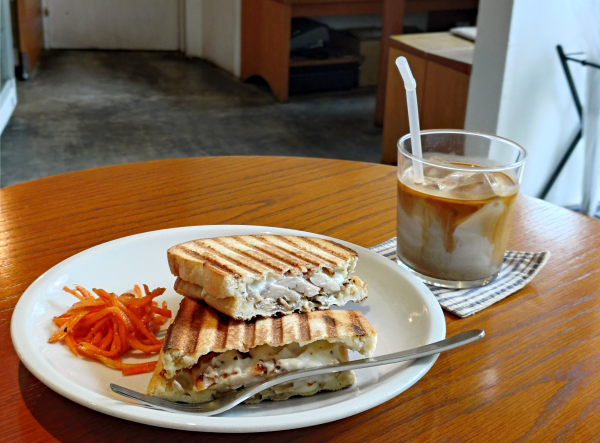 カフェラテおいしい~~~!!!家で淹れるのと全然違うなにこれ~~~私特別コーヒー好きってわけじゃないですけど、これが飲みやすくておいしいことはわかるぞ・・・!ホットサンドはサクサクの歯切れのいいパンにチキンとキノコたっぷり入ってます!これもうまっっっ!!