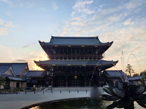 鈴虫寺から京都駅に戻る途中、もう閉門していますが外から東大寺を見て帰ろうということで撮った写真が噴水越しで良い感じに。夕陽のおかげで神々しさが。