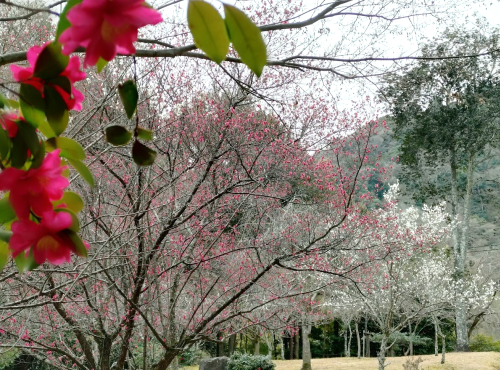 竹林をぬけて嵐山公園到着。まだ寒いのに世界に色が戻りはじめている・・・手前の椿が合成みたいになってるけど違いますからねこれ